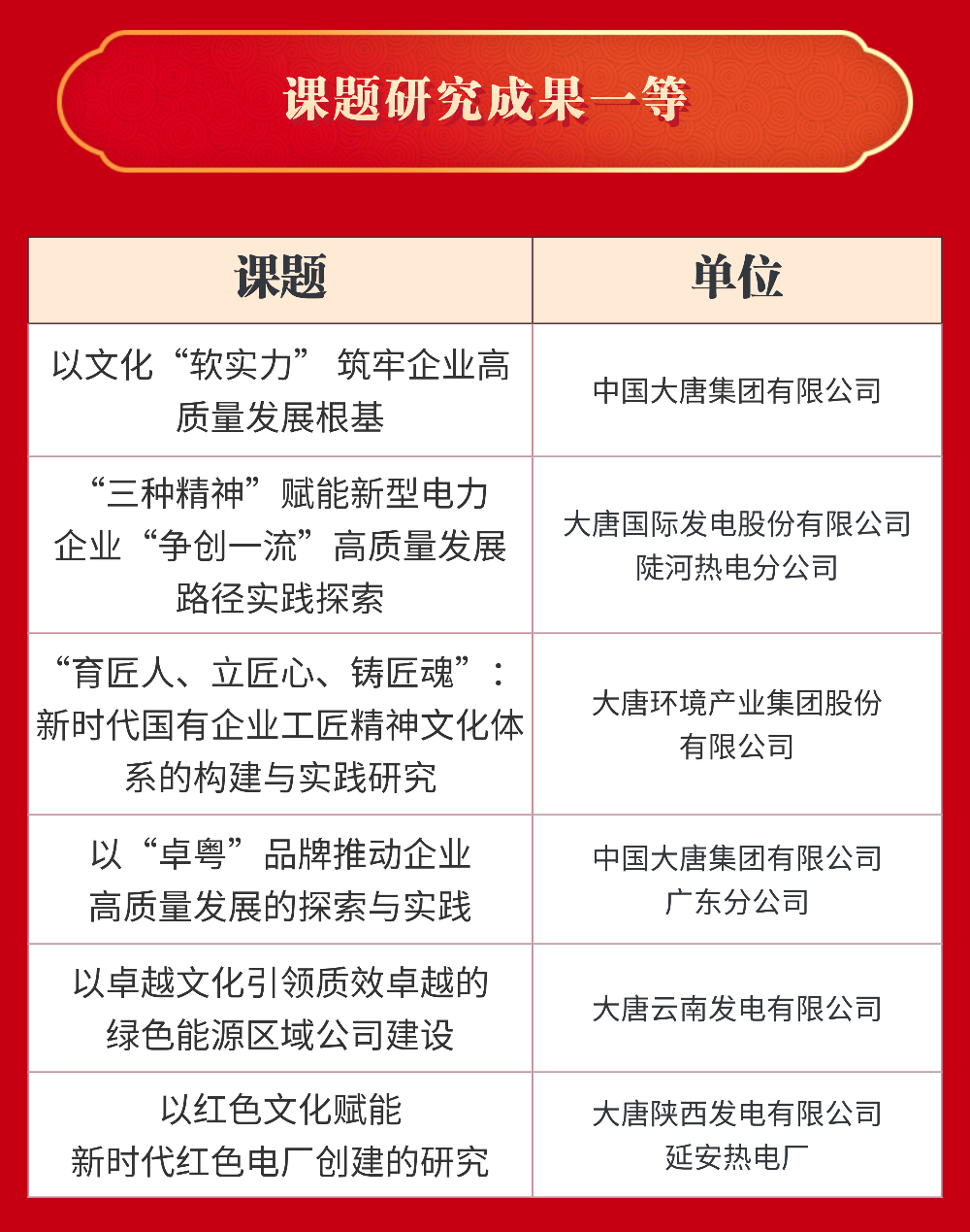 大唐国际发电股份有限公司等22家单位获评“十四五”企业文化建设与管理典型案例;威廉希尔williamhill及所属8家单位获评“十四五”企业文化建设与管理典型经验;威廉希尔williamhill及所属5家单位获评课题研究成果一等;大唐国际发电股份有限公司张家口发电分公司等6家单位获评课题研究成果二等。具体名单如下: